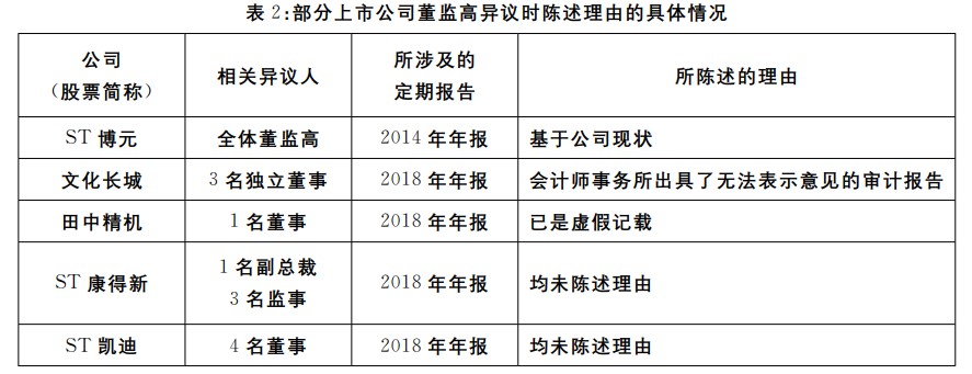 实践中,上市公司董监高并不重视异议规则中对于陈述理由的要求。无论入法前还是入法后,董监高异议制度均要求陈述理由,但是实际上陈述理由的情况并不理想。比如影响巨大的“兆新股份案”和“ST博元案”,在任董监高均仅表示了异议而几乎没有陈述理由,除此外ST康得新、ST凯迪、ST华讯等公司(股票简称)也存在董监高表示异议时并未陈述理由的情况。而安控科技、科迪乳业、长江健康等公司(股票简称)的董监高尽管在表示异议时陈述了理由,其所陈述理由也十分“敷衍”。(详见表2)。