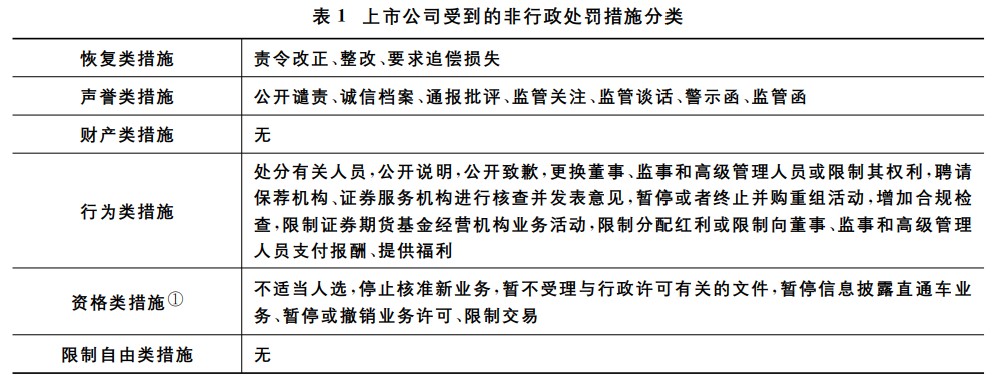 证券非行政处罚主要包括证监会和证监局的监管措施,以及证券交易所的自律措施两大类。2008年,证监会出台了《证券期货市场监督管理措施实施办法(试行)》,试图通过全面梳理法律法规和部门规章,规范监管措施的调整范围、适用原则、种类和实施程序等问题。2020年3月,证监会又根据新《证券法》的规定发布了《证券期货市场监督管理措施实施办法(征求意见稿)》。根据该办法第2条,我国证券监督管理措施的法律渊源主要包括法律、行政法规以及证监会规章。通过对现有法律、法规和规章的“监督管理”或“法律责任”一栏进行检索、整理,笔者发现,我国的证券监管措施共有49种。此外,证券交易所为了维护市场的公平、有序、透明等行政管理法益,有权对违法违规行为实施自律管理措施。《上海证券交易所纪律处分和监管措施实施办法》(2019年修订)和《深圳证券交易所自律监管措施和纪律处分实施办法》(2020年修订),共列举了38种自律措施。表1对上市公司公告受到的非行政处罚措施进行了分类。