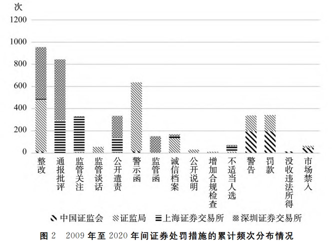 根据回应性执法理论,上述处罚措施依据制裁属性的强弱可以分为三类:(1)合作执法类,主要包括恢复类监管措施。此类处罚的制裁属性最弱,监管机构意图通过监管对象的自我纠正行为,达到合作执法的目的。(2)弱制裁类,主要包括非行政处罚中的“声誉类措施”和“行为类措施”以及行政处罚中的“声誉罚”。该类处罚的制裁属性较强,监管机构通过披露违法行为信息和要求违法行为人履行相应的义务,从而到达惩戒和威慑违法行为的目的。(3)强制裁类,主要包括非行政处罚中的“资格类措施”和行政处罚中的“财产罚”和“资格罚”。该类处罚的对抗属性最强,通过货币处罚、暂时或永久市场禁入达到制裁违法行为人的目的。