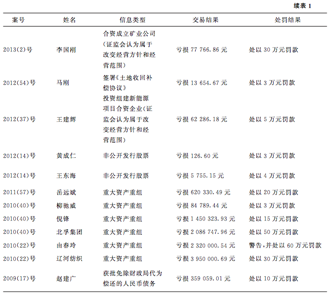 通过表 1 可以看到,内幕交易结果并非完全符合当事人预期,内幕交易行政处罚的实践也并不 符合“实际产生价格影响的”的重大性标准。事实上,证监会对内幕交易的定性并不受交易后的实际结果影响,交易结果只影响处罚措施。证监会在这些处罚书中认定内幕交易时通常侧重描述交