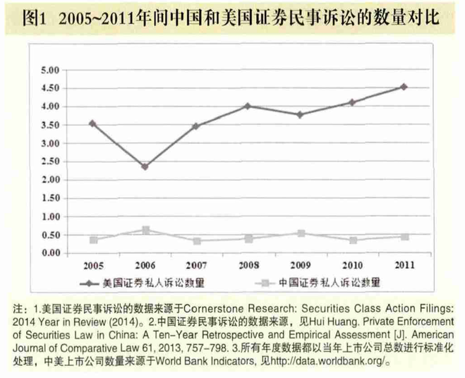 的律师”(Entrepreneur Lawyers)都可以独立执行证券 法。 16“多头执法”模式的特点是执法产出较高,哥伦 比亚大学法学院的科菲教授将其视为美国证券市场繁荣 的主要原因。17 图1比较了2005~2011年间中国和美国证 券民事诉讼的数量。为了保证数据的可比性,笔者用中 美两国当年上市公司总数对数据进行标准化处理,即以 证券民事诉讼的数量除以当年上市公司的数量。美国证 券民事诉讼发生的频率远高于中国,每百家上市公司年 均遭受诉讼的数量在2.34~4.51次之间,而我国每百家上 市公司年均遭受诉讼的数量在0.33~0.63次之间。现有研 究缺乏对投资者为什么“用脚投票”的实证研究,而大 样本的判决文本为回答该问题提供了充足的微观数据。