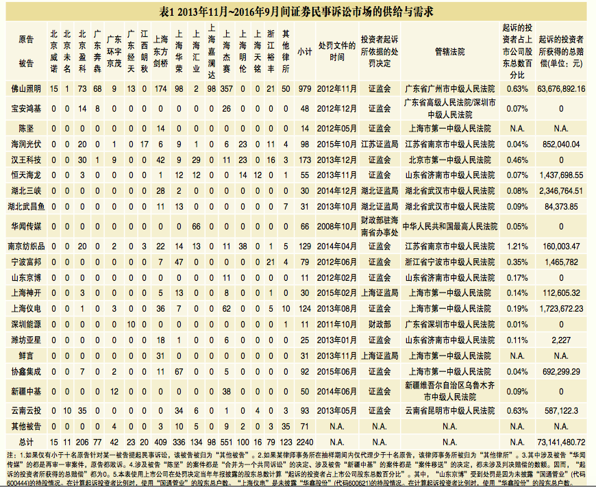 裁判网”和“OpenLaw”收集了人民法院在2013年11月1 日~2016年9月30日之间,作出的2309份关于证券虚假陈 述引发的民事赔偿案件的民事判决书和民事裁定书。18在剔除关于管辖权争议的民事裁定书后,本文研究样本变为1241份判决书和裁定书,共涉及33位被告19和2240 名投资者,有33家律师事务所20提供了法律服务。21其