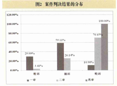 二审案件中,投资者胜诉的比例更低,仅有约3.41%(3/88)的原告上诉成功。二审法院判决原告胜诉 的原因有二:其一,原审法院对于损害赔偿的计算有 误;其二,原审法院审理时事实不清。约26.14%(23/88) 的原告因未按时预交案件受理费而被裁定撤诉。约 70.45%(62/88)的原告被判决败诉。在所有民事再审案件 中,人民法院皆判决驳回原告全部诉讼请求。