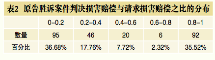 在所有原告撤诉和败诉的案件中,损害赔偿的数额 都被高估。而对于原告胜诉的案件,法院判决的损害赔 偿往往低于其请求的损害赔偿。为了测量证券律师高估 损害赔偿的程度,表2展示了涉及259位胜诉原告获得的 损害赔偿与请求的损害赔偿之间比率的分布。29第1列显