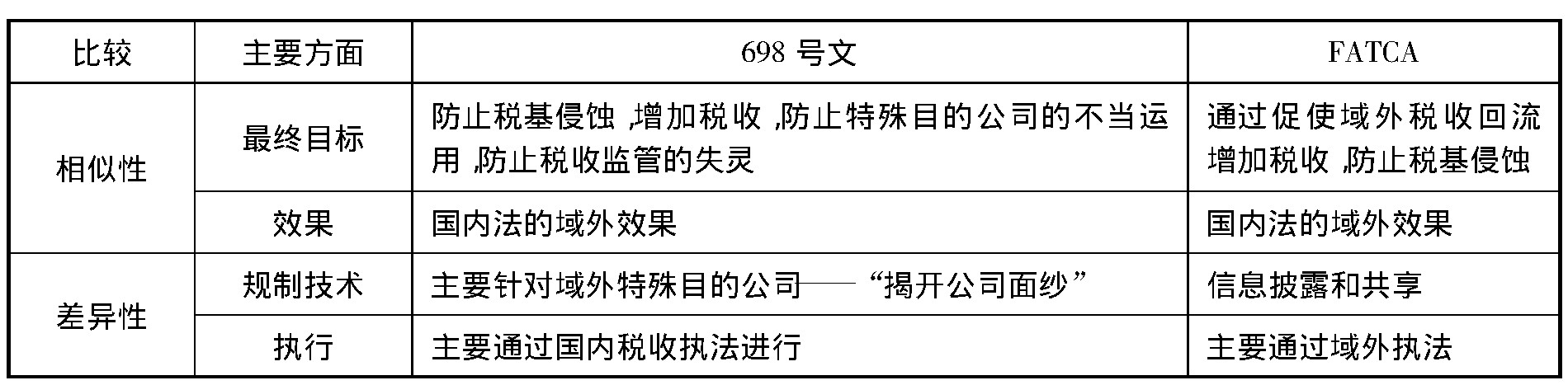 与FATCA形成鲜明对比,698号文未能促使外国实体向中国税务机关披露信息。这一缺失致使698号文的实施效果大打折扣。698号文的报告机制是在自愿和自我报告的基础上展开的,其实施很大程度上取决于地方税务局如何积极寻求严格执行698文的方法。中国可借鉴美国的做法,通过寻求与个别政府达成协议,要求对方披露金融信息以便决定纳税金额。698号文与FATCA的比较见下表1。