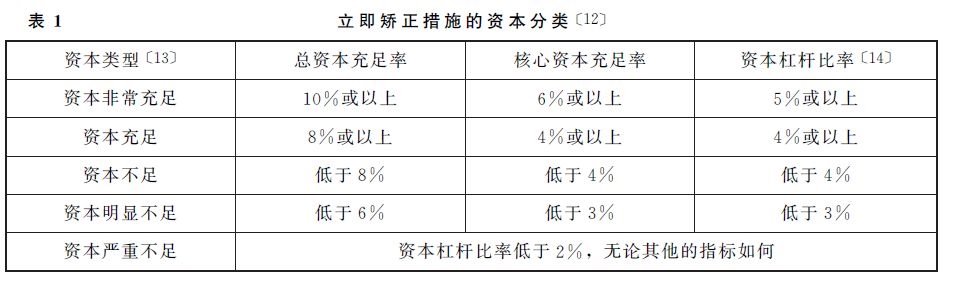首先,根据美国《联邦存款保险法》第38节的规定,联邦银行监管机构每个季度都根据资本情况将其监管的银行划分为五个等级,具体划分等级及标准如表1所示。