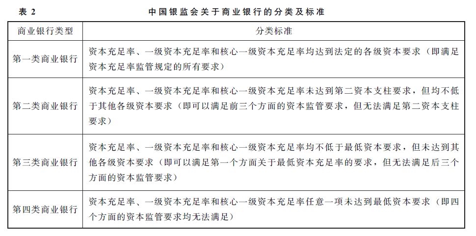其次,根据银行的资本充足状况,银监会将商业银行分为四类,如表2所示。