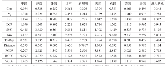 资料来源:雅虎财经、中国经济信息网的经济统计数据库、世界银行网站、国际货币基金组织网站注:M2,BL,DCP和SMC分别为广义货币量、银行贷款、私人信贷和股票市值占当年实际GDP的比重;Corr为周数据,每个国家和地区各有10359个观测值;Law和Distance为国家和地区数据,每个国家和地区各有1个观测值;其他变量均为年份数据,每个国家和地区各有23个观测值。