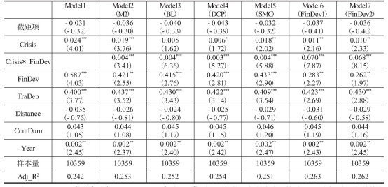 表2列出了以中国为样本的多元回归结果。从Model1的结果可以看出,Crisis的参数估计值为0.024,显著性水平达到1%,表明金融危机的爆发使得中国股票市场与其他市场的联动性有了显著提高,相关系数突然发生了变化,说明中国市场存在金融危机传染效应。Model2—Model5在此基础上引入金融发展的各个维度与Crisis的交乘项,回归结果显示,这些交乘项的参数估计值都显著为正,说明中国金融体系在不同层面的发展都会放大金融危机在中国的传染效应。相比而言,BL的显著性水平在四个维度中最高,说明银行业的快速发展更容易催生金融系统的脆弱性,加剧金融危机的蔓延态势。Model6和Model7在Model1的基础上,引入了金融发展综合指数与Crisis的交乘项。从表2中可以看出,两个模型的金融发展综合指数与Crisis的交乘项系数的回归结果均为正,且都在1%的水平上显著,再次表明伴随着中国金融发展的演进过程,国内经济更容易受到国际金融危机的冲击,支持了研究假设1。