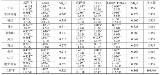 表3和表4列示了跨市场研究回归结果。其中,表3以各个市场为样本单独展开分析,采用式(1)进行回归分析。对于每个国家和地区而言,它与另外九个国家和地区分别组成九个群,每个群各有1151个观测值,九个群合计10359个观测值。从中可以看出,Crisis的回归系数都显著为正,说明金融危机传染效应是全球的普遍现象。而Crisis与FinDev交乘项的回归结果在各个国家和地区非常稳健,都显著为正,说明金融发展在推动经济增长的同时,也容易引发金融系统自身的脆弱性,从而加剧金融危机的传染风险,再次支持了研究假设1。