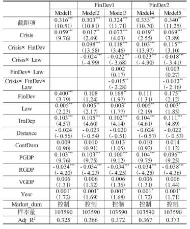 表4列出了全样本的多元回归结果。在该多元回归分析中,本文控制了其他可能对因变量产生影响的变量,以保证结论的稳健性。更为重要的是,本文可以重点考察对投资者的法律保护在金融危机传染中所发挥的作用。Model1中,Crisis的回归系数为0.059,达到1%的显著性水平,再次证明金融危机传染效应的存在。Mode2和Model4在Model1的基础上,引入Crisis与FinDev以及Crisis与Law的交乘项。从中可以看出,前者的回归参数分别为0.098和0.103,达到1%的显著性水平,说明金融发展加剧了外部危机对国内经济的冲击,加强了金融危机的传染效应,支持本文所提出的研究假设1;后者的回归参数分别为-0.024和-0.023,也达到1%的显著性水平,说明完善的投资者法律保护机制对于金融危机的传染效应会起到直接的阻隔作用,支持本文所提出的研究假设2。Mode3和Model5进一步引入了Crisis,FinDev,Law三者的交乘项。回归结果表明,交乘项的参数估计值分别为-0.012和-0.010,达到5%的统计显著水平,说明完善的投资者法律保护机制有助于削弱金融发展在危机传染上的放大效应,支持本文所提出的研究假设3。