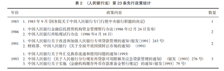 通过表1不难发现这4部法律里都存在经济政策先行的现象,也就是说,通过经济政策的先行实施,然后转化为相应的法条。如1983年的《国务院关于中国人民银行专门行使中央银行职能的决定》对中国人民银行作为中央银行的地位进行了规定,随后《人民银行法》第2条将其以法律的形式确定下来;1985年中国人民银行《关于调整部分存款、贷款利率的报告》对于中央银行利用利率作为杠杆调整经济进行了规定,之后《人民银行法》在第23条对此做了专门规定;又如《中国人民银行贯彻国务院关于当前产业政策若干要点决定》(银发〔1989〕150号)对在银行业中贯彻国家产业政策进行了说明,在后来颁布的《中华人民共和国商业银行法》(以下简称《商业银行法》)第34条对商业银行依照国家产业政策开展的业务活动进行了法律层面的规定。由此可见,在银行法中通过政策先行的做法具有普遍性。