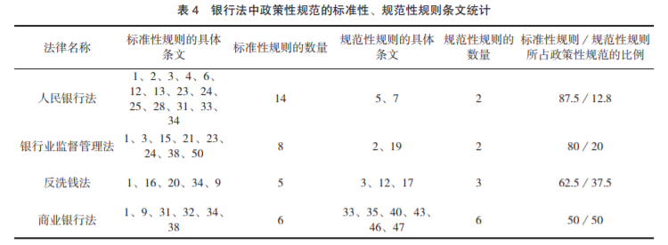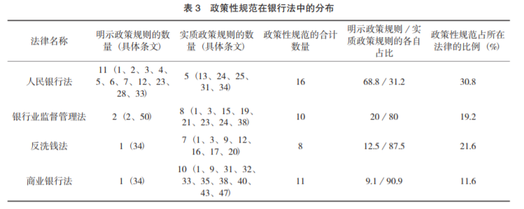 对于政策性规范,有学者通过对中国60部已经制定完成的经济方面的法律进行实证考查,发现“政策”一词在其中的20部法律里共出现了87次,政策客观上已是经济法规范的一种表达形式(单飞跃和张玮,2012)。如果具体到银行法方面,《人民银行法》出现了20次,《银行业监督管理法》出现了2次,《反洗钱法》出现了1次,《商业银行法》出现了1次。把这种有“政策”二字的政策性规范称之为“明示政策规则”。事实上,除了直接以“政策”二字来表达的政策性规范外,还有一类没有“政策”二字出现的政策性规范,这种政策性规范虽然没有“政策”两个字,实际上仍然是经济政策入法后的规范表达。例如:《银行业监督管理法》第3条规定,银行业监督管理应当保护银行业公平竞争,提高银行业竞争能力。这条规则其实是关于竞争政策的规定。把这一类政策性规范称为“实质政策规则”。“明示政策规则”和“实质政策规则”共同构成了政策性规范。通过表3可以清晰地发现,在4部法律之中均有政策性规范的存在。其中,《人民银行法》的政策性规范占到全部法律的30.8%,《银行业监督管理法》的占到19.2%,《反洗钱法》的占到21.6%,《商业银行法》的占到11.6%。这说明了政策性规范是客观存在于经济法之中的。进一步分析,除了《人民银行法》的“明示政策规则”比“实质政策规则”多之外,另外3部法律的“实质政策规则”均远超过“明示政策规则”,这说明经济法中政策的存在,不能简单地以是否有“政策”来判定,其实大多数的政策可能是以“实质政策规则”而存在的,这更进一步证明了政策性规范在经济法中存在的事实。