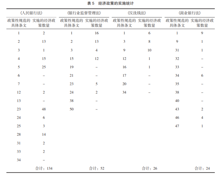正如前述,政策性规范主要是标准性规则,具有一定的原则性,因此,需要经济政策的实施来落实。例如,《银行业监督管理法》第1条规定了“对银行业进行监督、防范和化解金融风险”的政策目标,为了实施该条规定的政策目标,一共出台了16个经济政策来维护金融稳定。总的来看(参见表5),每一部银行法都需要经济政策的实施,其中《人民银行法》有134个、《银行业监督管理法》有52个,《反洗钱法》有26个、《商业银行法》有24个,所以,经济政策实施已经成为一种常见的调整方法,它在每一部银行法中都有运用。