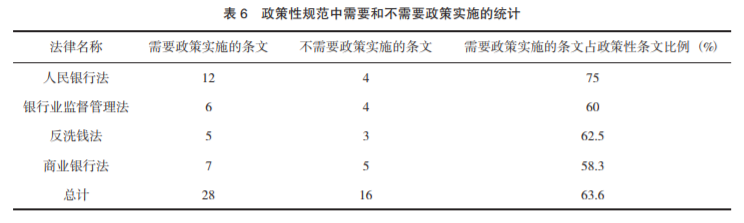 首先,经济法中的多数政策性规范都需要经济政策的实施。从表6中可以发现需要经济政策实施的政策性规范比例较高。具体来讲,《人民银行法》有75%、《银行业监督管理法》有60%、《反洗钱法》有62.5%、《商业银行法》有58.3%,均超过了50%。此外,从整体上统计,需要经济政策实施的政策性规范占所有政策性规范的比例达到了63.6%,这表明大部分政策性规范都需要经济政策实施,充分说明了经济政策实施的重要性。