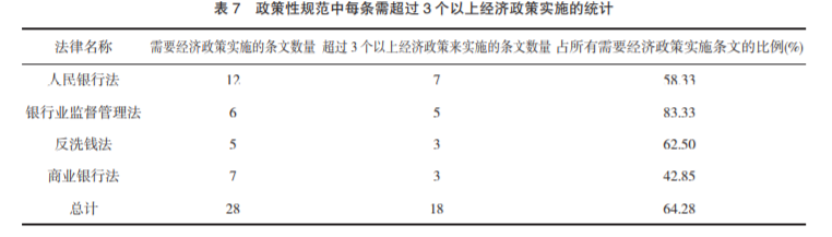 其次,在需要经济政策实施的政策性规范中,多数的政策性规范还需要数量较大的经济政策来实施。例如,从表5中可以看到,《人民银行法》第23条需要48个经济政策来实施,《银行业监督管理法》第1条需要16个,《反洗钱法》第9条需要10个,《商业银行法》第1条需要9个。显然,经济政策实施的数量较大。如果我们以每条政策性规范是否有多个(3个以上)经济政策实施为标准,那么就会发现(参见表7),《人民银行法》有58.33%以上的条文是需要超过3个以上的经济政策实施,《银行业监督管理法》有83.33%,《反洗钱法》有62.50%,《商业银行法》有42.85%,最少的《商业银行法》也有超过1/3。而从总体上来讲,有64.28%的条文是需要多数经济政策实施来实现的,由此可见经济政策实施的重要性。