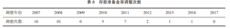 首先,以存款准备金率的调整来说明。自《人民银行法》颁布以来,央行已经依法多次调整了存款准备金率。如果以2007年到2017年的数据展开分析(参见表8),可以发现在这11年间,央行实施了36次调整。以2007年为例,仅2007年央行就依法对存款准备金率进行了10次上调,根据当时的计算,2007年12月25日提高1个百分点后,就可一次性回收流动性资金近4000亿元,从而在一定程度上冲销国内过剩的流动性。