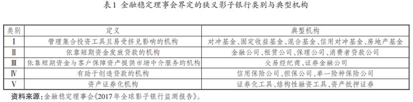 一般认为,影子银行指那些无银行之名而有银行之实的机构和业务。影子银行既包括可能引发系统性风险的信用中介机构和业务,即狭义影子银行,也包括所有影子信用体系之外的信用中介体系,即广义影子银行。根据金融稳定理事会的界定标准,狭义影子银行类别与典型机构如表1所示。