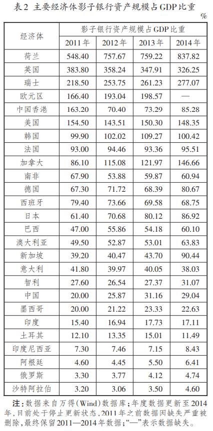 根据万得数据库的金融稳定理事会全球影子银行监测数据,全球影子银行资产规模占GDP比重2011年为113.08%,2012年为116.05%,2013年为121.86%,2014年为127.64%。可以看出,在此期间全球影子银行资产规模占GDP比重一直呈现明显递增的发展态势。从主要经济体影子银行资产规模占GDP比重(表2)看,2011年,占比较高的经济体有荷兰、英国、瑞士、欧元区、中国香港、美国等,占比较低的经济体有印度尼西亚、阿根廷、俄罗斯和沙特阿拉伯,说明经济发展水平和资本账户开放程度较高的经济体其影子银行资产规模通常也比较大,当年我国的占比为20.00%,在各主要经济体中的排名比较靠后。2014年,荷兰以837.82%的占比位列第一,英国和瑞士分别以326.25%和277.07%的占比位列第二和第三,美国和加拿大分别以148.35%和146.66%的占比位列第四和第五,我国的占比为29.04%,在各主要经济体中的排名依然比较靠后。综合来看,发达经济体和开放型经济体其影子银行资产规模占GDP比重的排名整体好于发展中经济体和资本账户开放程度不高的经济体。