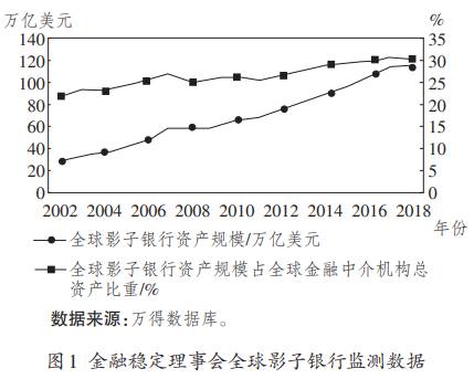 根据万得(Wind)数据库最新统计数据,2002—2018年,全球影子银行资产规模及其占全球金融中介机构总资产的比重均呈现出明显递增的发展态势。2002年,全球影子银行资产规模仅为28.19万亿美元,占全球金融中介机构总资产的比重为21.77%。在资本逐利动机驱使下,全球影子银行资产规模不断扩大,占全球金融中介机构总资产的比重不断增加,2007年上升至阶段性高峰,资产规模为59.10万亿美元,占全球金融中介机构总资产的比重为26.96%,六年时间里,全球影子银行资产规模占全球金融中介机构总资产的比重增加超过了5个百分点。2008年,受全球金融危机影响,全球影子银行资产规模占全球金融中介机构总资产的比重自2002年以来首次环比下降,当年全球影子银行资产规模为61.11万亿美元,占全球金融中介机构总资产的比重为25.98%。从发展趋势看,受金融危机后各国对影子银行加强监管影响,2009—2012年,全球影子银行资产规模占全球金融中介机构总资产的比重基本保持不变,但全球影子银行资产规模依然稳中有升。2012年之后,全球影子银行资产规模及其占全球金融中介机构总资产的比重持续增加,从整个样本观察期看,2002年以来的最高峰出现在2017年,当年全球影子银行资产规模达到114.76万亿美元,占全球金融中介机构总资产的比重为30.70%。2018年,全球经济不确定性加大,全球影子银行资产规模占全球金融中介机构总资产的比重继2008年、2011年环比下降后出现了第三次环比下降,当年全球影子银行资产规模为114.30万亿美元,占全球金融中介机构总资产的比重为30.16%。具体参见图1。