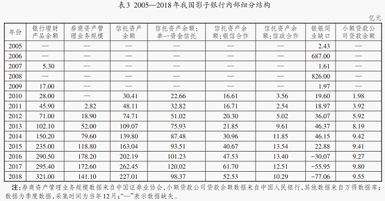 从我国影子银行内部细分结构(表3)看,我国影子银行的统计数据集中出现在2008年金融危机之后的2010年。在此之前,只有银行理财产品余额、银银同业缺口两项数据可以观测。2008年金融危机爆发后,为加强对影子银行的监管,我国开始对影子银行进行较为全面的数据监测。2011年,我国影子银行资产来源中占比较高的是信托资产余额和银行理财产品余额,分别为48.11亿元和45.90亿元,银银同业缺口规模也相对较大,为18.97亿元。2015年,占比最高的是银行理财产品余额、信托资产余额、券商资产管理业务规模等。2018年,银行理财产品余额以321.00亿元位列第一,信托资产余额以227.01亿元位列第二,券商资产管理业务规模以141.10亿元位列第三。整体来看,在我国影子银行内部,银行理财产品余额、券商资产管理业务规模和信托资产余额占绝对大的比重,是我国影子银行主要的资产来源。