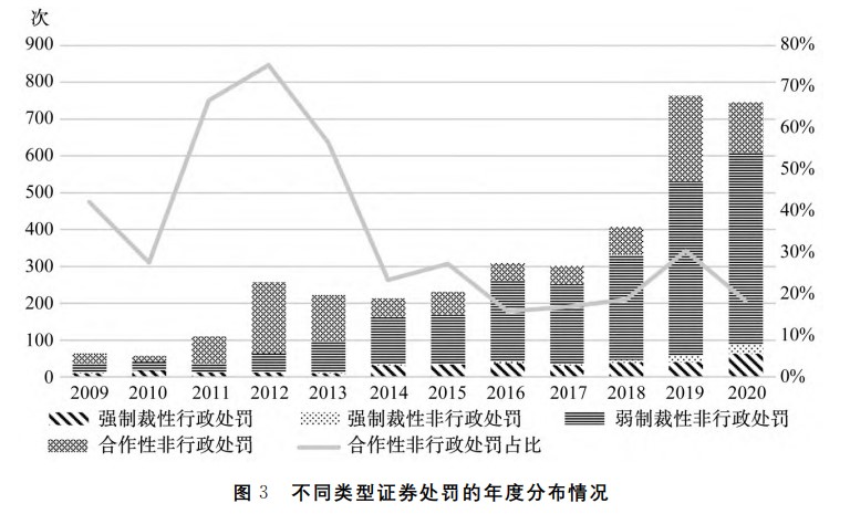 根据回应性执法理论,上述处罚措施依据制裁属性的强弱可以分为三类:(1)合作执法类,主要包括恢复类监管措施。此类处罚的制裁属性最弱,监管机构意图通过监管对象的自我纠正行为,达到合作执法的目的。(2)弱制裁类,主要包括非行政处罚中的“声誉类措施”和“行为类措施”以及行政处罚中的“声誉罚”。该类处罚的制裁属性较强,监管机构通过披露违法行为信息和要求违法行为人履行相应的义务,从而到达惩戒和威慑违法行为的目的。(3)强制裁类,主要包括非行政处罚中的“资格类措施”和行政处罚中的“财产罚”和“资格罚”。该类处罚的对抗属性最强,通过货币处罚、暂时或永久市场禁入达到制裁违法行为人的目的。