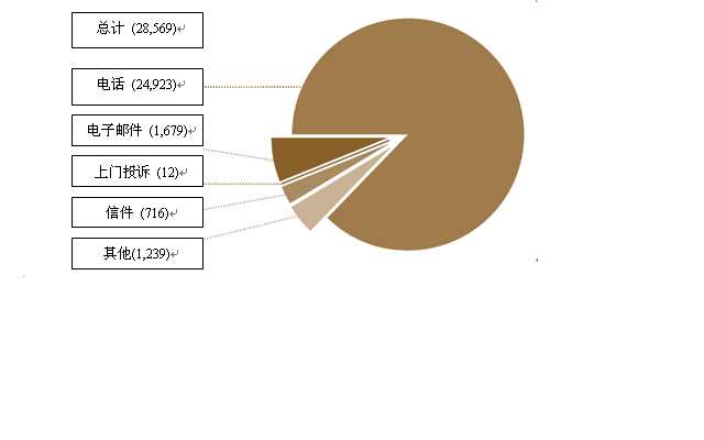 3.投诉手段多样,服务免费。消费者可以拨打免费电话向FCAC进行投诉,也可以通过电子邮件投诉,还可以书面投诉。无论何种投诉方式,FCAC的处理都是免费的。在这些咨询与投诉途径中,用得最多的还是电话途径。以2008财年为例,FCAC共受理28,569件咨询与投诉,其中通过电话咨询与投诉的有24,923件,占比87%(如图4所示)。