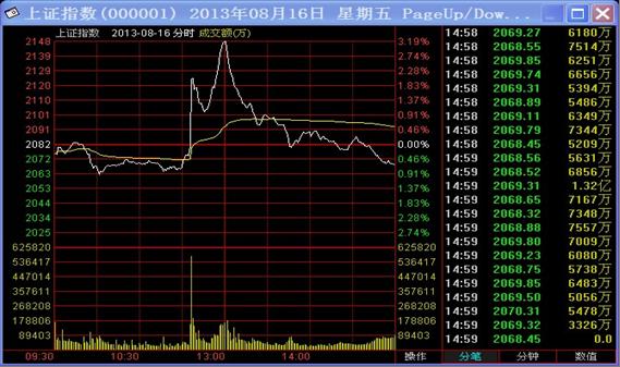 特别值得注意的是,交易软件可以清晰地显示,16日上午因为光大证券的巨量买入,上海证券交易所综合股价指数(简称上证综指或上证指数)在极短时间内从11时06分启动,在K线图上通过一个几乎笔直的上涨,到11时08分达到全日最高2198点,这时基本上没有其他买入资金。由于一些投资者见机抛盘,11点17分达到区间最低点2102.5点,但由于更多投资者在市场传言误导下,错误地认为11时06-08分的上涨是重大利好或类似原因所致,更多资金开始买入,上证综指11点18分开始反弹,11点30分上午收盘之际逐渐达到2146点。