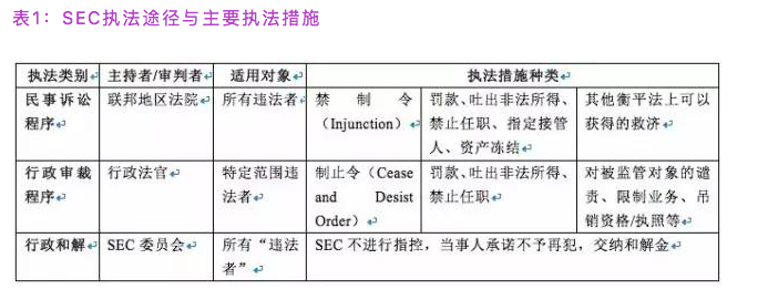 灵活多样的执法措施。证券违法类型复杂多样,往往牵涉专业人士和重大经济利益。因此,应有包括申诫罚、资格罚和财产罚等在内的多样化执法措施,才能恰当地制裁违法。通常,执法者的权力会因为处置证券市场危机而得到增强,SEC在历经多次市场危机之后拥有了强大的“武器库”(见表1),通过单独或者综合运用这些执法措施,SEC成为备受尊重与敬畏的“华尔街警察”。正像一位前SEC委员指出的,“通过罚款、吐出非法所得和制止令,SEC可以获得它想要的所有救济”。