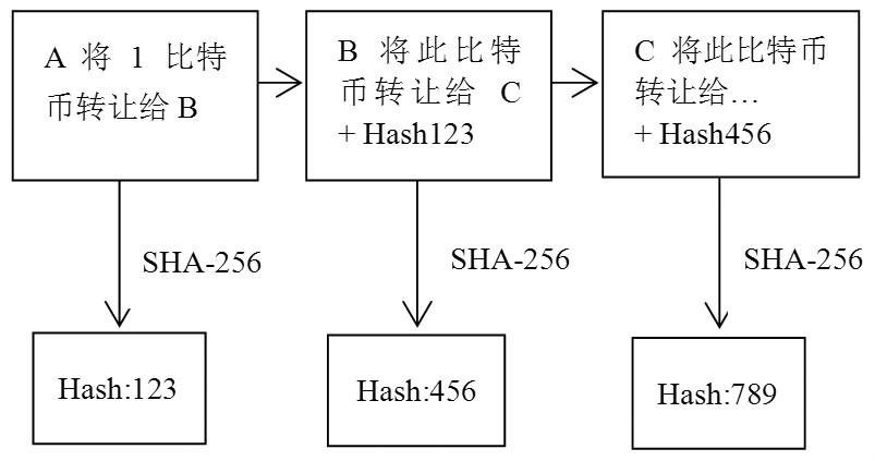 1,我们知道,A与B的交易信息根据SHA-256加密形成了64位字符的哈希值(Hash),假设该哈希值为123;在B将比特币转让给C的过程中,前次交易信息即Hash123也将被包含在B与C的交易信息中,并经SNH-256加密形成新的Hash456,再次通过矿工工作量证明和共识机制达成交易。此后涉及的所有交易均是如此,每一次交易的Hash值都包含了前次交易的信息,即每一笔交易都包含了与比特币有关的所有交易信息。