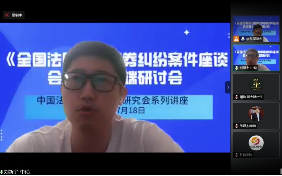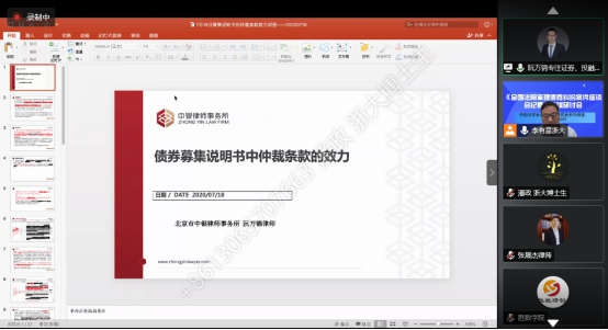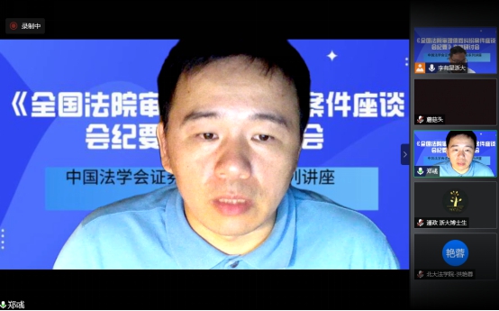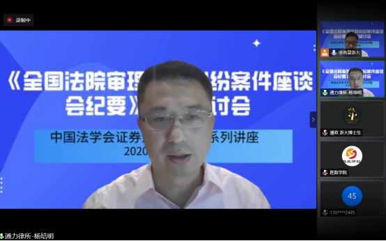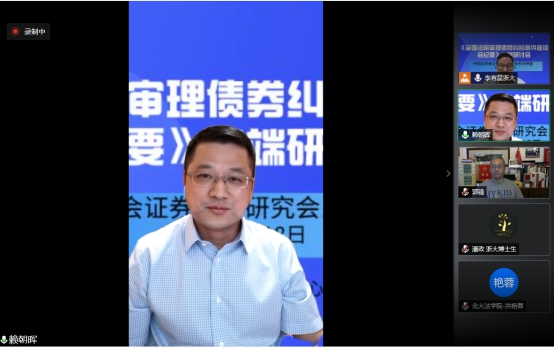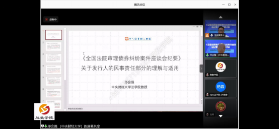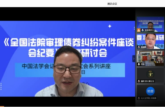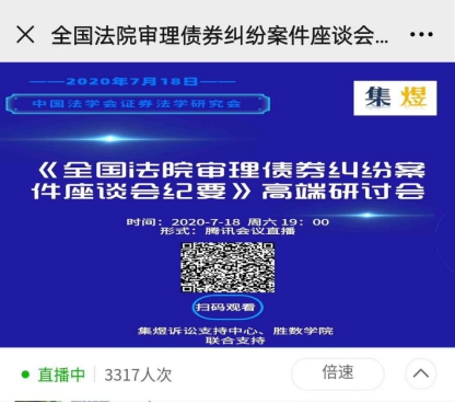2020年7月15日最高人民法院发布了《全国法院审理债券纠纷案件座谈会纪要》(以下简称《纪要》),为深入学习理解和准确适用《纪要》,2020年7月18日晚,中国法学会证券法学研究会组织召开了“全国法院审理债券纠纷案件座谈会纪要高端研讨会”网络会议。此次研讨会由中国法学会证券法学研究会副会长、浙江大学光华法学院李有星教授主持,中国证券法学研究会会长、最高人民法院研究室副主任郭锋教授,中国证监会债券部赖朝晖处长,中国政法大学研究生院院长李曙光教授,中国商法研究会副会长、中国人民大学法学院叶林教授,北京大学法学院副教授洪艳蓉,中国证券法学研究会副会长秘书长、中央财经大学法学院教授邢会强,北京大学法学院教授彭冰、华东政法大学教授郑彧,浙江大学城市学院教授谭立以及券商、律师等专家25人发表精彩深度的演讲,大家充分肯定了纪要的里程碑的重大意义,肯定了纪要的价值目标和重要的制度创新,系统深入分析了纪要的逻辑,理解和应用重点难点,优点和不足,并提出完善建议,特别是针对纪要需要出台容易明确边界的券商监管政策,修改公司法增加公司债专章,最好制定债券法。本次高端研讨会采用网络直播的形式,在小鹅通平台进行了同步直播持续五个多小时,共有四千余人次在线观看收听和学习,取得了良好的社会反响和效果。研讨会为宣传《纪要》内容、帮助社会各界准确理解和适用《纪要》做出了贡献,为营造债券市场诚信举债、勤勉尽责的制度环境,保护投资者和债券持有人权益、确保国家债券市场规范发展和金融安全贡献专家智慧。