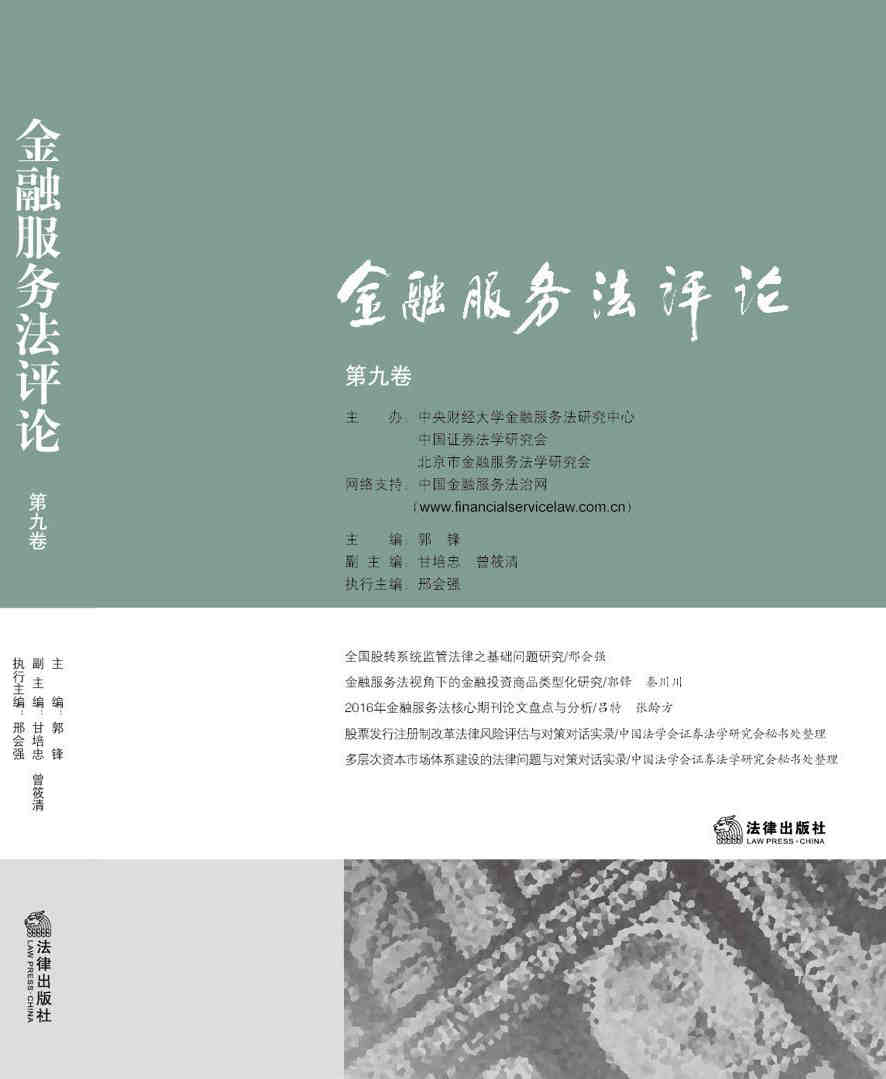 研究综述 2016年金融服务法核心期刊论文盘点与分析/吕特 张龄方 金融整顿背景下的金融服务法学——2016年度中国金融服务法学研究动态与综述/李静芸张龄方 《证券法》修改与中国资本市场法治建设——中国法学会证券法研究会2017年年会会议综述/中国法学会证券法学研究会秘书处 混业经营背景下的金融服务法治——北京市金融服务法学研究会2016年年会综述/吕特